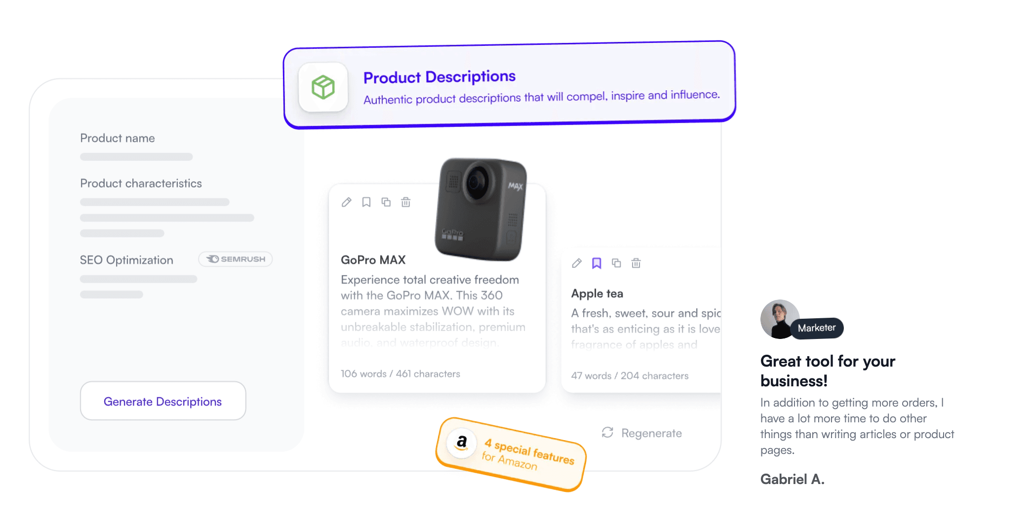 Improve your store’s Google ranking & boost sales through our eCommerce tools. Generate engaging, SEO-optimized titles, descriptions, and benefit bullet points for your products. When your content is synchronized and semantically accurate, Google will place your products high in the search results.