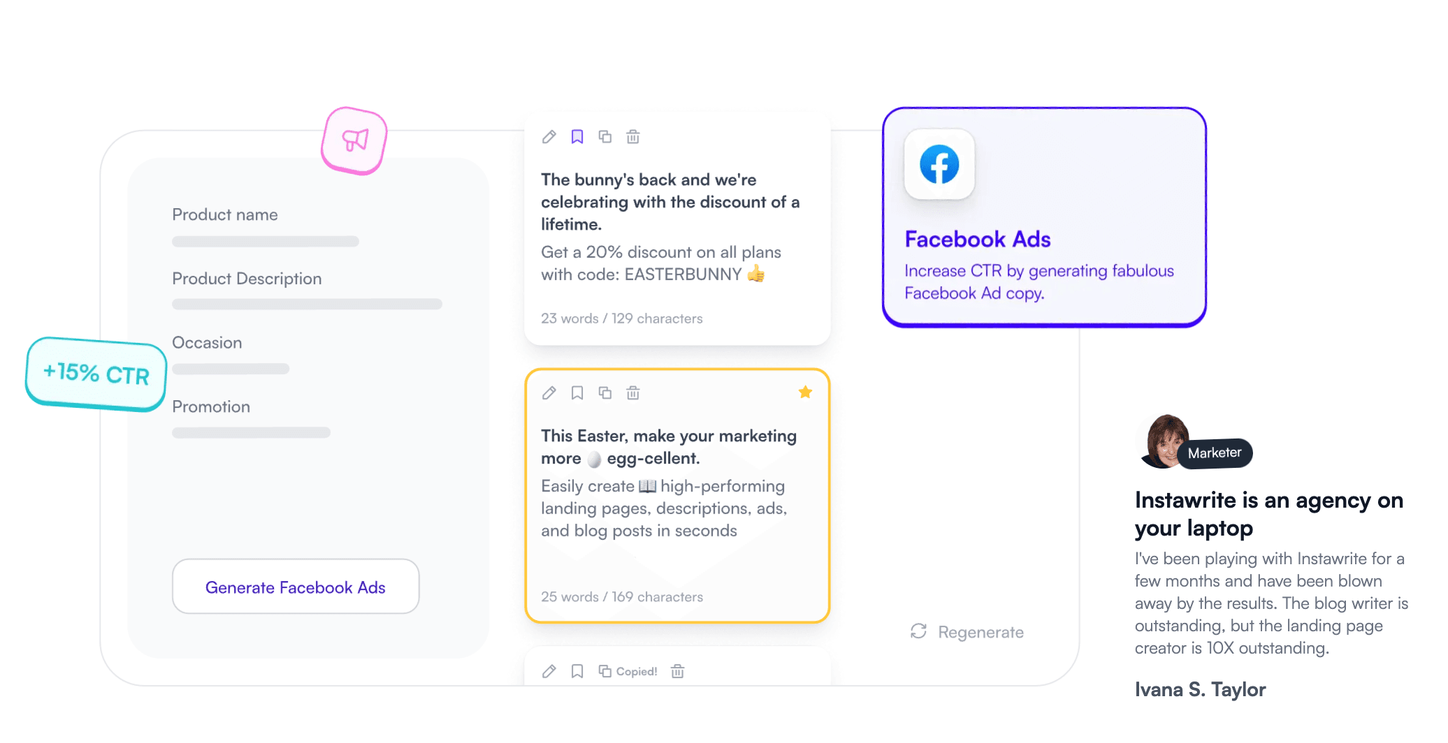 I'm constantly doing A/B tests. Instawrite allows me to create the B version in seconds or minutes, but not hours, which allows me to run so many more tests than I otherwise could. It's creating high converting copy. I absolutely love it.
